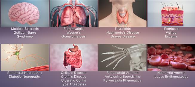 occur when the body's immune system mistakenly attacks healthy tissues because it doesn't "recognize" the recognition proteins on its own cells. , This leads to chronic inflammation and damage.