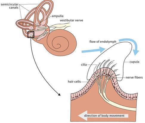 movement "sloshes" endolymph which pushes on cupola which triggers sensory hair cells.